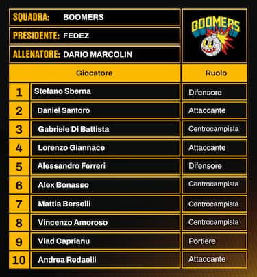 La squadra di Fedez è già ben composta, considerando sia la presenza del vicepresidente Luciano Moggi che di Dario Marcolin, allenatore ufficiale dei Boomers. La prima scelta ha riguardato il reparto difensivo con Stefano Sberna (79 di overall), seguito da Daniel Santoro (attaccante, 82 di overall), Gabriele Di Battista (centrocampista, 78 di overall), Lorenzo Giannace (attaccante, 85 di overall), Alessandro Ferreri (difensore, 77 di overall), Alex Bonasso (centrocampista, 77 di overall), Mattia Berselli (centrocampista, 80 di overall), Vincenzo Amoroso (centrocampista, 76 di overall), Vlad Caprianu (portiere, 73 di overall) e Andrea Redaelli (attaccante, 77 di overall).