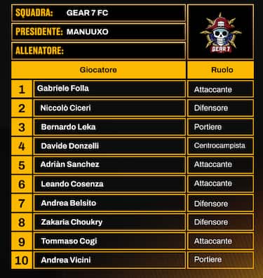 La squadra di Emanuele Nocera (conosciuto sui social come Manuuxo) è quella dei Gear 7. La prima scelta è stata Gabriele Folla (attaccante, 80 di overall), seguito da Niccolò Ciceri (difensore, 77 di overall), Bernardo Leka (portiere, 75 di overall), Davide Donzelli (centrocampista, 76 di overall), Adrian Sanchez (attaccante, 82 di overall), Leando Cosenza (attaccante, 78 di overall), Andrea Belsito (difensore, 74 di overall), Zakaria Choukry (difensore, 74 di overall), Tommaso Cogi (attaccante, 78 di overall) e Andrea Vicini (portiere, 74 di overall).