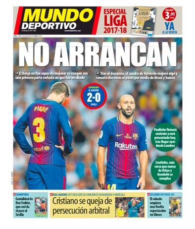Dal lato del Barcellona, l’euforia si trasforma in delusione. Niente da fare per la formazione blaugrana al cospetto di un Real cinico e spietato, riuscito a capitalizzare al meglio le occasioni create nell’arco delle due partite. Ciò che la stampa spagnola, però, non perdona a Messi e compagni è la scarsa verve mostrata in campo, un comportamento difficile da spiegare che Sport sintetizza in un eloquente "Senz’anima". Leo Messi e Sergi Roberto gli unici a salvarsi dal naufragio dei blaugrana che, adesso, potranno consolarsi con gli arrivi di Paulinho e Coutinho. Dura anche la prima pagina del Mundo Deportivo che sottolinea la resa del Barcellona. In spalla, spazio infine al mercato con Paulinho e Coutinho che si avvicinano e Dembelé che si complica.