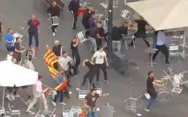 Calcio, politica e una buona dose di incoscienza. Doveva essere una manifestazione pacifica per esprimere il dissenso contro il gruppo indipendentista catalano, ma si è trasformata in una lotta tra frange ultras su una terrazza della Plaza de Cataluña. Una vera e propria rissa a colpi di sedia, secondo El Pais non ci sarebbero arrestati ma la polizia locale pare abbia identificato diverse persone.
