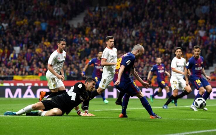 Il Siviglia sembra uscire dagli spogliatoi con il giusto piglio. Dietro però non ha capito la lezione del primo tempo e dopo sette minuti subisce anche la rete del 4-0, che tanto somiglia a quella precedente. Iniesta scambia con Messi, salta con una finta Soria e cala il poker a porta sguarnita. Il centrocampista – primatista di presenze in Coppa del Re con 73 presenze – torna a segnare nella competizione dopo tre anni e non poteva scegliere una serata migliore, visto che è l’ultima finale con i colori blaugrana della sua carriera. Il Barcellona non si accontenta e va a un passo dal quinto gol. Il portiere salva sul colpo di testa di Suarez, poi è fortunato sul rimpallo con Umtiti che da pochi passi non riesce ad andare in rete. La furia catalana non si placa e anche Busquets vuole partecipare alla festa del gol. Il suo destro dalla distanza sfiora il palo e grazia il Siviglia. La squadra andalusa torna finalmente a farsi vedere in fase offensiva con uno spunto personale di Sandro Ramirez, entrato per Correa, che percorre tutta la fascia ma pecca di freddezza davanti a Cillessen.