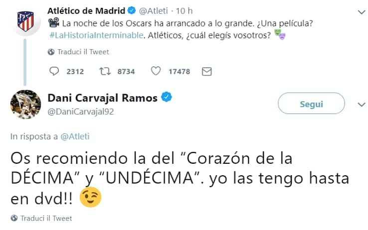 Una polemica social che sta infiammando il web. Protagonisti? L'’Atletico Madrid e Dani Carvajal, difensore del Real Madrid. Un botta e risposta via social che in Spagna, e non solo, non è passato inosservato. A lanciare la prima stoccata è il club rojiblanco su Twitter, orario 23.55: "La notte degli Oscar è iniziata alla grande. Un film? #LaHistoriaInterminable. Atletico, voi quale scegliete?". Un tweet che secondo molti fa riferimento tra le righe al contestato calcio di rigore assegnato per fallo su Casemiro in Levante-Real che ha permesso alla squadra di Solari di portare a casa un prezioso successo nei minuti finali del match di Liga.. Tra le tante interazioni al tweet dell'Atletico, arriva una risposta che fa decisamente 'rumore': "Consiglio 'Il cuore della Décima e dell’Undécima'. Le ho anche su DVD", il tweet di Dani Carvajal delle 00.10. Dal campo ai social: l'ennesimo capitolo di un derby davvero infinito.