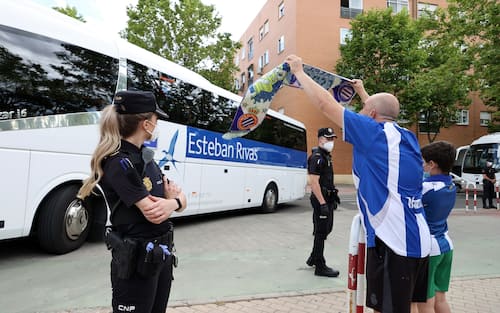 Questo tifoso è riuscito ad arrivare fin sotto il bus del Getafe, guardato a vista dagli agenti spagnoli.