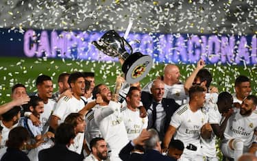 SI FESTEGGIA SENZA PUBBLICO: i coriandoli, l'inno ufficiale del club e l'immancabile foto di gruppo dei neocampioni di Spagna. Alla festa del Real allo stadio Di Stefano sono mancati soltanto i tifosi