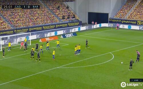 La prima al minuto 25, con il Cadice che difende il vantaggio di 1-0 (gol di Gimenez all'8°). Mentre Messi si prepara al tiro, gli avversari si dispongono su tre linee, creando di fatto tre "mini-barriere": la prima è quella classica, formata da 3 uomini (con un quarto staccato), poi altri 4 giocatori nel cuore dell'area, a coprire le diverse traiettorie possibili, infine altri due sulla linea di porta, ai lati del portiere. In totale, 11 uomini, tutti nell'area di rigore