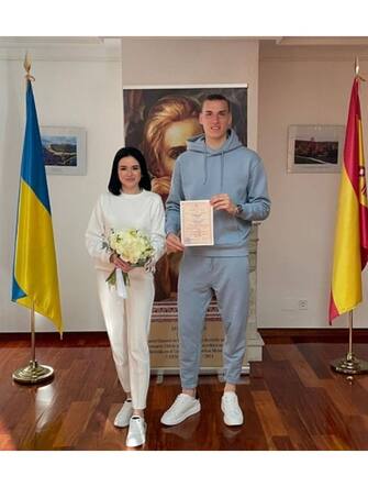 IL "SÌ" IN TUTA. Il 18 marzo l'estremo difensore ucraino e la bella Anastasia Tamazova hanno pronunciato il fatidico "sì", a Madrid, in tenuta decisamente ginnica...