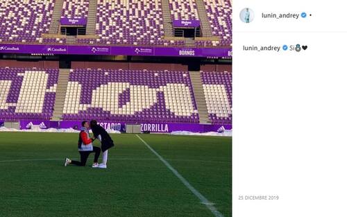 LA PROPOSTA DI MATRIMONIO IN CAMPO. Li avevamo lasciati così, allo stadio José Zorrilla, per una proposta di nozze direttamente "sul campo" e non sorprenderà allora più tanto la scelta di Andriy Lunin - ex portiere del Valladolid e oggi tornato alla casa madre Real - di optare per un abbigliamento "sportivo" nel giorno delle sue nozze...