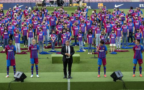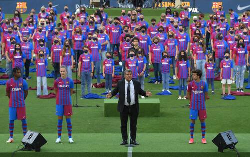 Una grande festa, all'interno del Camp Nou, per presentare la nuova maglia con il presidente del Barcellona, Laporta, nelle vesti del direttore d'orchestra, a dirigere lo show. Il club blaugrana ha svelato ufficialmente la sua divisa per la stagione 2021-2022