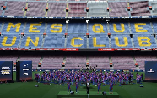Al Camp Nou il club blaugrana ha presentato la divisa ufficiale che indosserà nella prossima stagione. Accanto al presidente Laporta i giovani Ansu Fati e Riqui Puig, oltre a due rappresentanti della squadra femminile