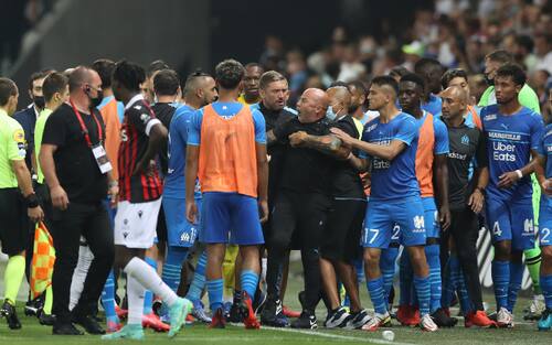L'allenatore del Marsiglia se la prende in particolare con un addetto alla sicurezza del Nizza e vengono quasi alle mani, separati a fatica dagli altri presenti