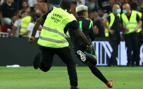 I giocatori del Nizza cercano di mettersi in mezzo e rispedire i tifosi fuori dal terreno di gioco