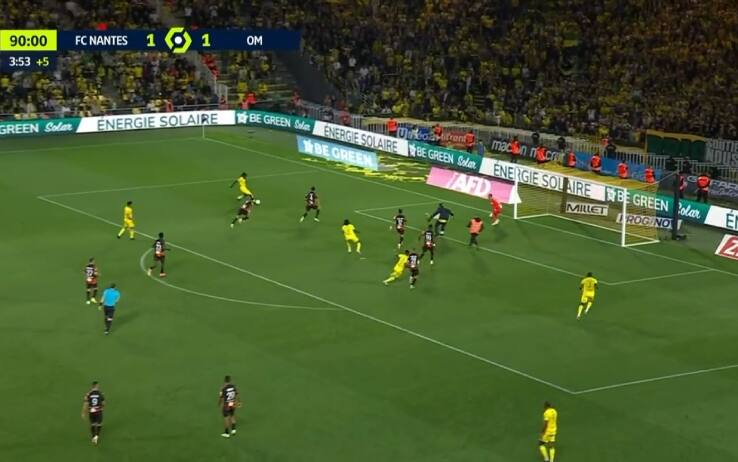 Riavvolgiamo il nastro. Minuto 94, Nantes-Marsiglia è sull'1-1 e con i padroni di casa che, nonostante l'inferiorità numerica, sono in attacco. L'azione, che ha portato il Nantes a ritrovarsi nell'area di rigore avversaria, viene però interrotta dall'invasione sconsiderata di un tifoso proprio del Nantes, entrato dal lato di campo dietro la porta del Marsiglia. Nelle immagini, dinamica più che chiara: azione dalla sinistra e palla in mezzo, sulla traiettoria c'è proprio il tifoso braccato da due addetti alla sicurezza che lo bloccano e lo accompagnano all'esterno del campo da gioco.