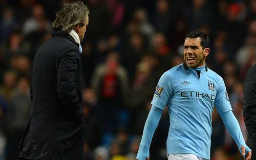 Non meno complicato è stato il rapporto tra il 'Mancio' e Carlitos. Un po' come successo tra Gattuso e Bakayoko, è stata una mancata sostituzione ad accendere il diverbio tra i due. Tevez rifiuta di scaldarsi per entrare in campo e, dopo la richiesta di scuse, vola in Argentina per un paio di mesi. Secondo alcuni dei protagonisti, al diverbio seguì una piccola rissa negli spogliatoi tra i due protagonisti della vicenda