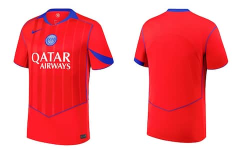 - Il terzo kit del Psg è rosso con i dettagli in blu. Caratterizzato da due tonalità di rosso a creare un effetto a righe verticali molto sfumato, i nostalgici noteranno che è ispirato al look "total 90" molto in voga all'inizio degli Anni Duemila (con il logo circolare "90" all'interno del colletto che è un richiamo inconfondibile)