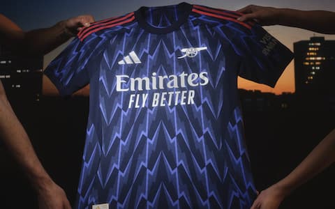 - La seconda maglia dei Gunners combina due tonalità di blu, una scura e una chiara, con loghi in argento metallizzato e dettagli in rosso. Il motivo a fulmine caratterizzerà l'intera parte frontale della maglia. Un motivo che riprende, trent'anni dopo, la divisa da trasferta dell'Arsenal nella stagione 1995/1996.