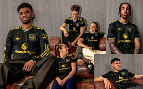- Terza maglia dal tocco retro per lo United. Il kit abbina una base nera a dettagli gialli e blu, in una rivisitazione della divisa da trasferta indossata dal club tra il 1993 e il 1995