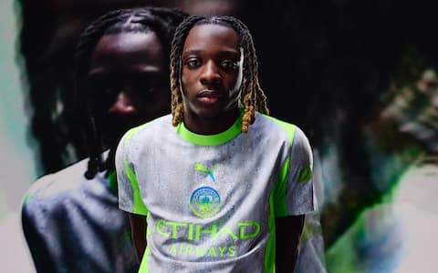 - Look unico per la terza maglia dei Citizens: base in grigio/argento, con una stampa che imita le gocce d'acqua su un vetro. I dettagli sulle maniche, sulle spalle, sul colletto e per i loghi del club, sono in verde neon.
