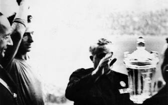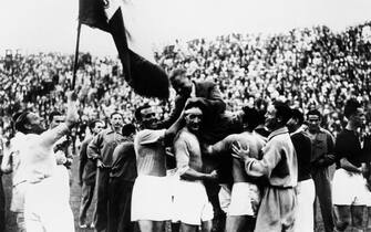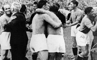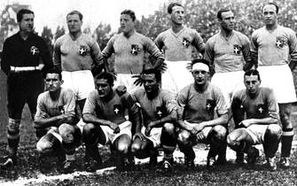 La formazione: in piedi da sinistra Combi, Monti, Ferraris IV, Allemandi, Guaita, Ferrari; in ginocchio da sinistra Schiavio, Meazza, Monzeglio, Bertolini, Orsi