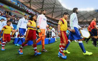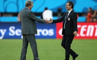 Stretta di mano tra i ct Hodgson e Prandelli poco dopo l'arrivo delle due squadre allo stadio di Manaus -