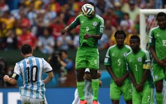I giocatori della barriera nigeriana hanno solo potuto osservare il pallone che saliva sopra le loro teste -