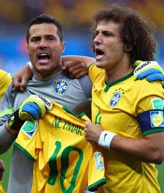 LA FOTOGALLERY. La squadra di Scolari, molto carica (forse troppo) per la semifinale contro i tedeschi, ha dato tutto durante l'esecuzione dell'inno nazionale. Julio Cesar e David Luiz mostrano la maglia di Neymar