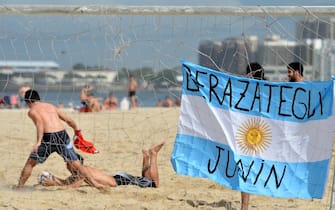 Inevitabili quindi gli striscioni dei tifosi piazzati in spiaggia. Magari dietro le porte per una partitella di calcetto improvvisata, come nel caso di questi tifosi argentini -