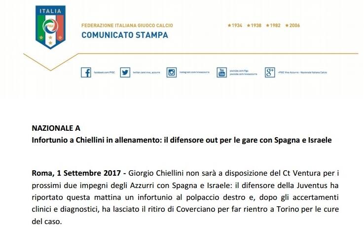 Il difensore della Juventus ha riportato un infortunio muscolare al polpaccio destro durante l'ultimo allenamento della Nazionale prima della partenza per Madrid. Chiellini salterà sia la partita contro la Spagna di sabato sera sia quella contro Israele il 5 settembre e ha già lasciato il ritiro di Coverciano