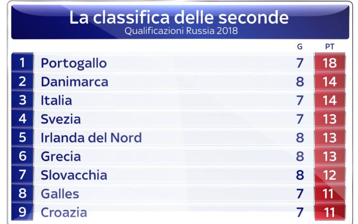 Le altre 4 squadre saranno le vincenti dei playoff, a cui parteciperanno le 8 migliori seconde dei 9 gironi. Il grafico in alto mostra l'attuale situazione: Italia, Irlanda del Nord, Danimarca e Slovacchia sono già sicure del secondo posto; la Grecia quasi (le basta sconfiggere Gibilterra); il Portogallo potrebbe arrivare prima sconfiggendo la Svizzera; la Croazia se perdesse in Ucraina le cederebbe il posto; la Svezia sarebbe seconda anche se perdesse 6-0 in Olanda, ma potrebbe arrivare prima se la Francia non vincesse in casa con la Bielorussia; per il Galles spareggio con l'Irlanda (ma a Bale e compagni basta il pari). Attualmente la peggiore seconda è la Croazia.