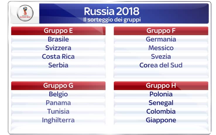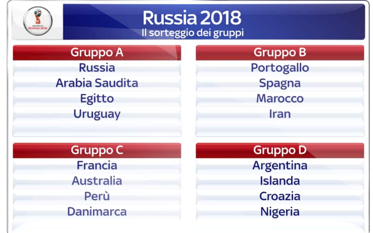 Il sorteggio dei Gironi dei Mondiali di Russia 2018. I padroni di casa sfideranno l'Arabia Saudita nella partita inaugurale in programma il 14 giugno a Mosca. Nel Gruppo D l'Argentina dovrà vedersela con Croazia, Islanda e Nigeria. Più abbordabile il Girone del Brasile, che trova Svizzera, Costa Rica e Serbia. Spagna-Portogallo a duello nel Gruppo B
