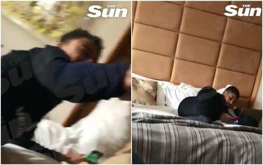 Ecco alcuni fotogrammi del video del tifoso finto-barbiere: il saluto con Lingard e la conversazione anche con Rashford nella loro stanza al The Grove (foto The Sun)
