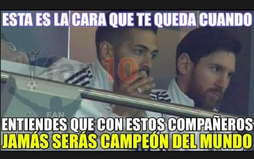 Messi non c’era, dopo aver già saltato anche la partita contro l’Italia. Le telecamere non hanno potuto fare a meno di inquadrarlo mentre guardava la pesantissima sconfitta materializzarsi in campo. “Questa è la tua espressione quando guardi la squadra con cui dovrai vincere il Mondiale”. Eloquente, no?