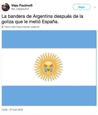 Dopo la pesantissima sconfitta per 6-1 contro la Spagna in amichevole i social non hanno perdonato l’Argentina. Higuain il più criticato, Messi incredulo in tribuna, e anche il sole sulla bandiera della nazione sembra aver ormai cambiato espressione…
