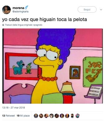 Ancora Simpson (i più gettonati), e ancora sfottò, ma questa volta per Higuain, reo di essersi divorato un gol clamoroso sullo 0-0 e poi di essere completamente sparito dalla partita. Anche Marge non sembra approvare