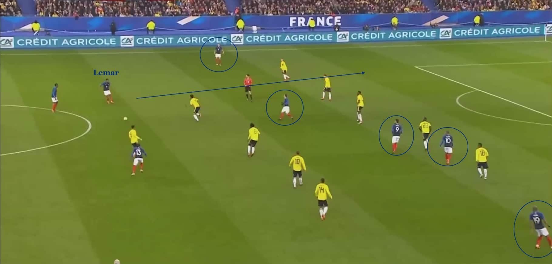 Contro la Colombia Deschamps ha schierato quello che nominalmente era un 4-4-2, con Mbappé e Lemar esterni teorici di centrocampo e Giroud e Griezmann come punte. Seguendo le rispettive inclinazioni, Lemar si accentrava vicino ai centrocampisti per cucire il gioco, mentre Mbappé stringeva verso le punte. Le loro posizioni venivano poi occupate dagli esterni bassi, Sidibé e Digne, intasando offensivamente l’attacco. A volte questo sovraccarico produceva effetti positivi, come nel primo gol di Giroud, nato da una grande verticalizzazione di Lemar per Digne oltre la difesa.