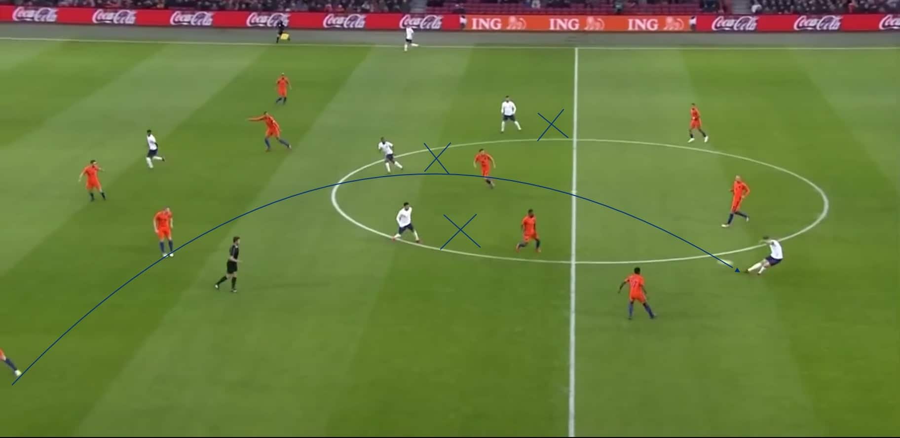 Sia contro l’Italia che contro l’Olanda l’Inghilterra ha faticato a controllare il gioco, e contro gli azzurri sono stati costretti a lunghe fasi di difesa posizionale, soprattutto nel secondo tempo. Il problema principale, per l’Inghilterra, è che è molto difficile provare a controllare le partite senza avere a disposizione dei centrocampisti di livello. Per quanto paradossale per una squadra che negli ultimi ha prodotto dei centrocampisti formidabili, oggi l’Inghilterra non ha quasi letteralmente nessuno da schierare a centrocampo. Contro l’Olanda davanti alla difesa ha giocato Jordan Henderson - che ha però delle letture limitate col pallone - mentre contro l’Italia ha giocato Dier, più preciso nella distribuzione ma sempre piuttosto scolastico. Accanto a loro hanno giocato due ali abbassate da mezzali, cioè Oxlade-Chamberlain e Lindgard, che hanno un gioco monodimensionale. L’Inghilterra non aveva praticamente soluzioni per avanzare con la palla, se non le conduzioni palla al piede dei propri giocatori.