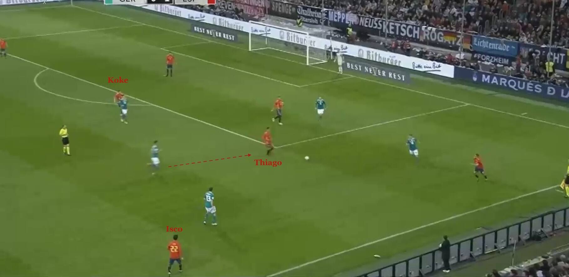 Nelle due partite Lopetegui ha dovuto però fare a meno di Busquets, la cui assenza ha reso più problematica l’uscita del pallone, soprattutto nell’amichevole contro la Germania, forse l’unica squadra che può contestare il pallone alle “Furie Rosse”. I tedeschi pressavano sin dall’impostazione di De Gea, non sempre a proprio agio nella gestione della palla, e lo facevano con un’organizzazione nei tempi e negli spazi con pochi eguali fra Nazionali. Una situazione che ha scoperto le debolezze spagnole nella prima costruzione senza Busquets. Silva, Iniesta, Isco, Thiago e Koke si alternavano nell’abbassarsi per aiutare l’uscita della palla, ma non avevano la qualità del centrocampista del Barcellona nel gioco a parete e nel proteggere la sfera spalle alla porta.