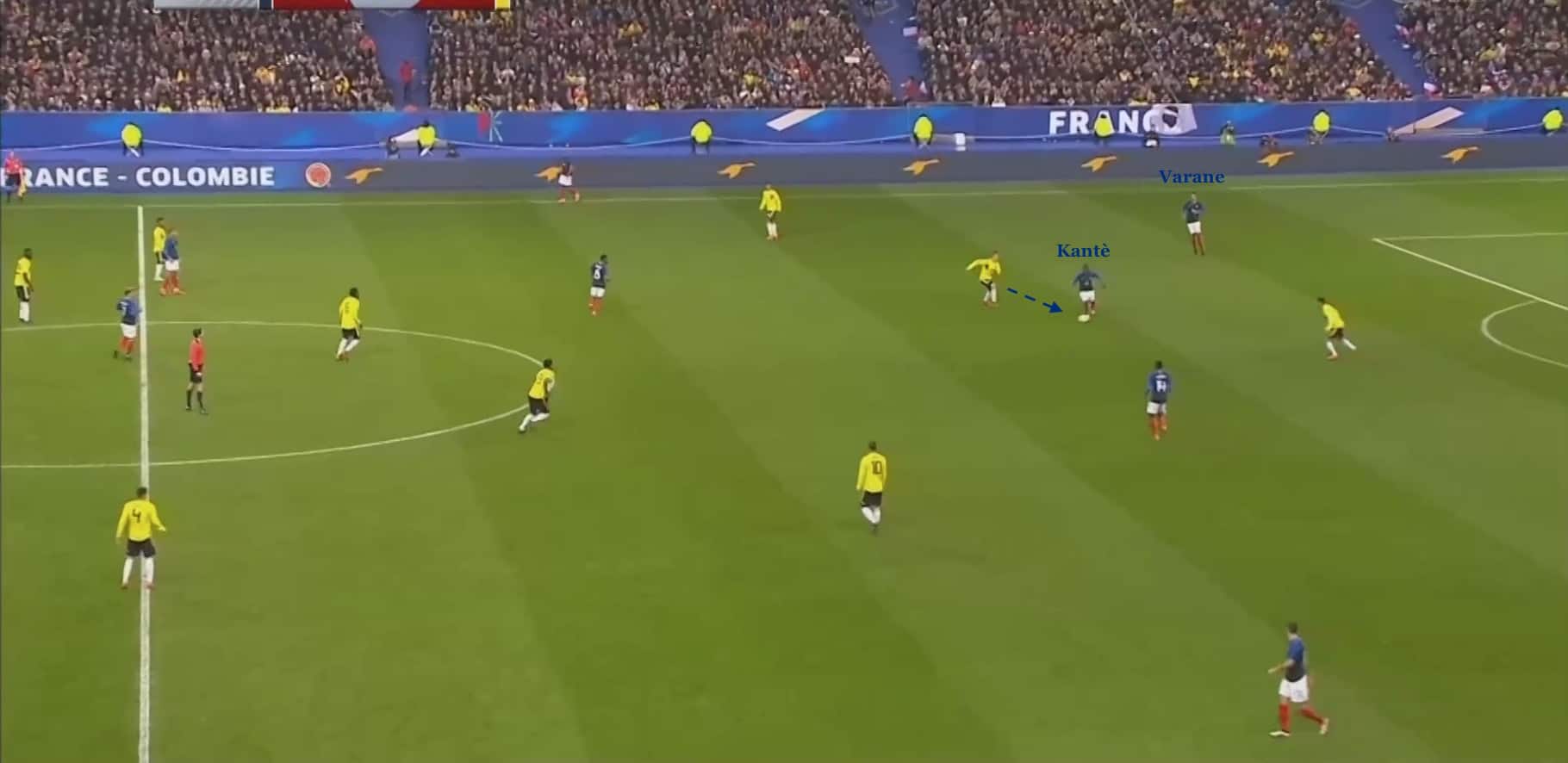 Il secondo gol della Colombia. Varane, che aveva perso una brutta palla da ultimo uomo poco prima, non si fida di portare palla e liberare una linea di passaggio, così scarica corto su Kanté, che però controlla male il pallone e se lo fa portare via.