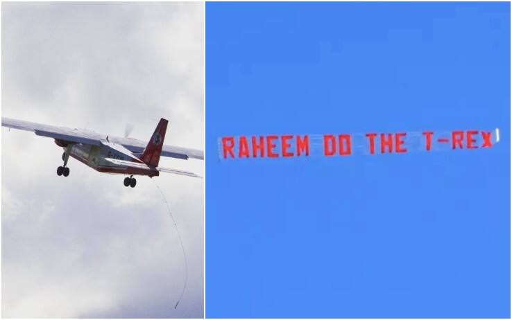 Insolito momento durante l'ultima amichevole dell'Inghilterra prima del Mondiale. Nel cielo vola un aereo con la scritta: "Sterling, fai il T-Rex". Una promessa tra l'ala del City e il presentatore tv britannico Jack Whitehall. Ecco spiegato il motivo dietro la bizzarra esultanza richiesta al calciatore inglese