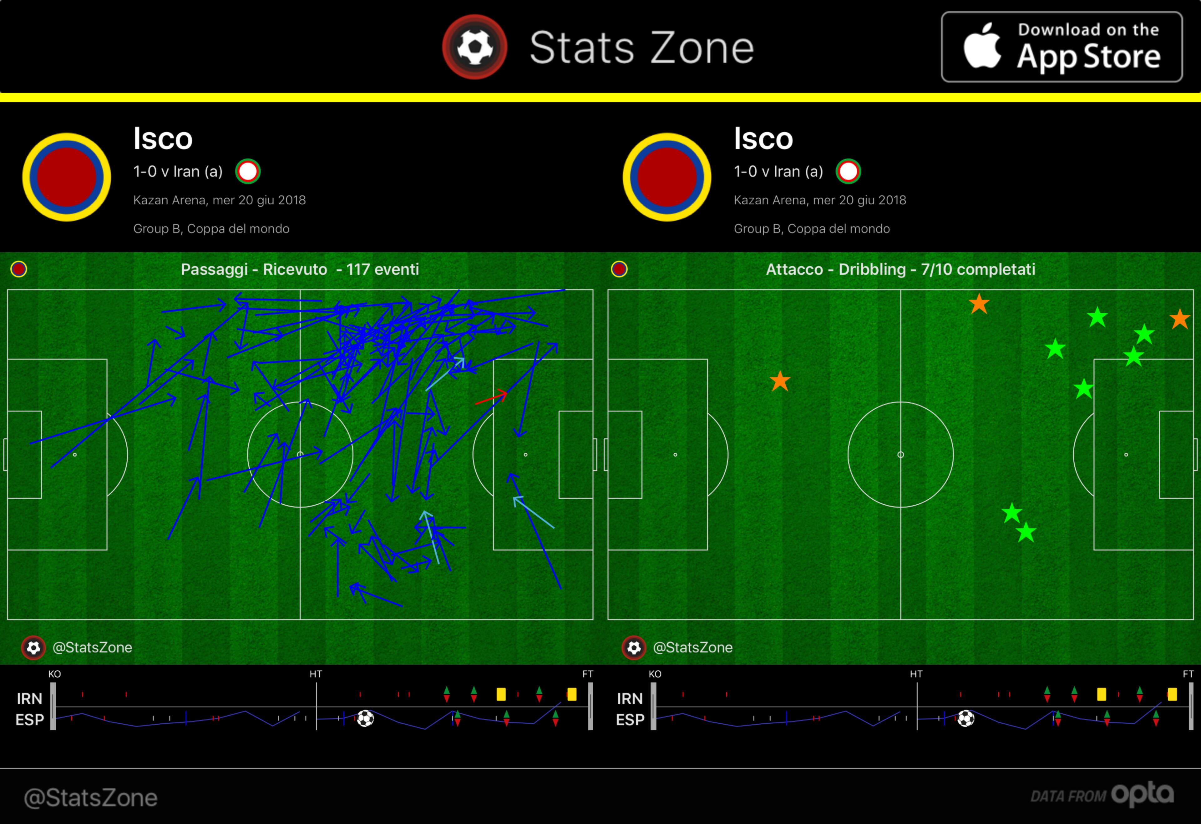 Isco contro l’Iran: dove ha ricevuto i passaggi e dove ha dribblato (le stelline verdi sono i dribbling riusciti). Immagine via Stats Zone.