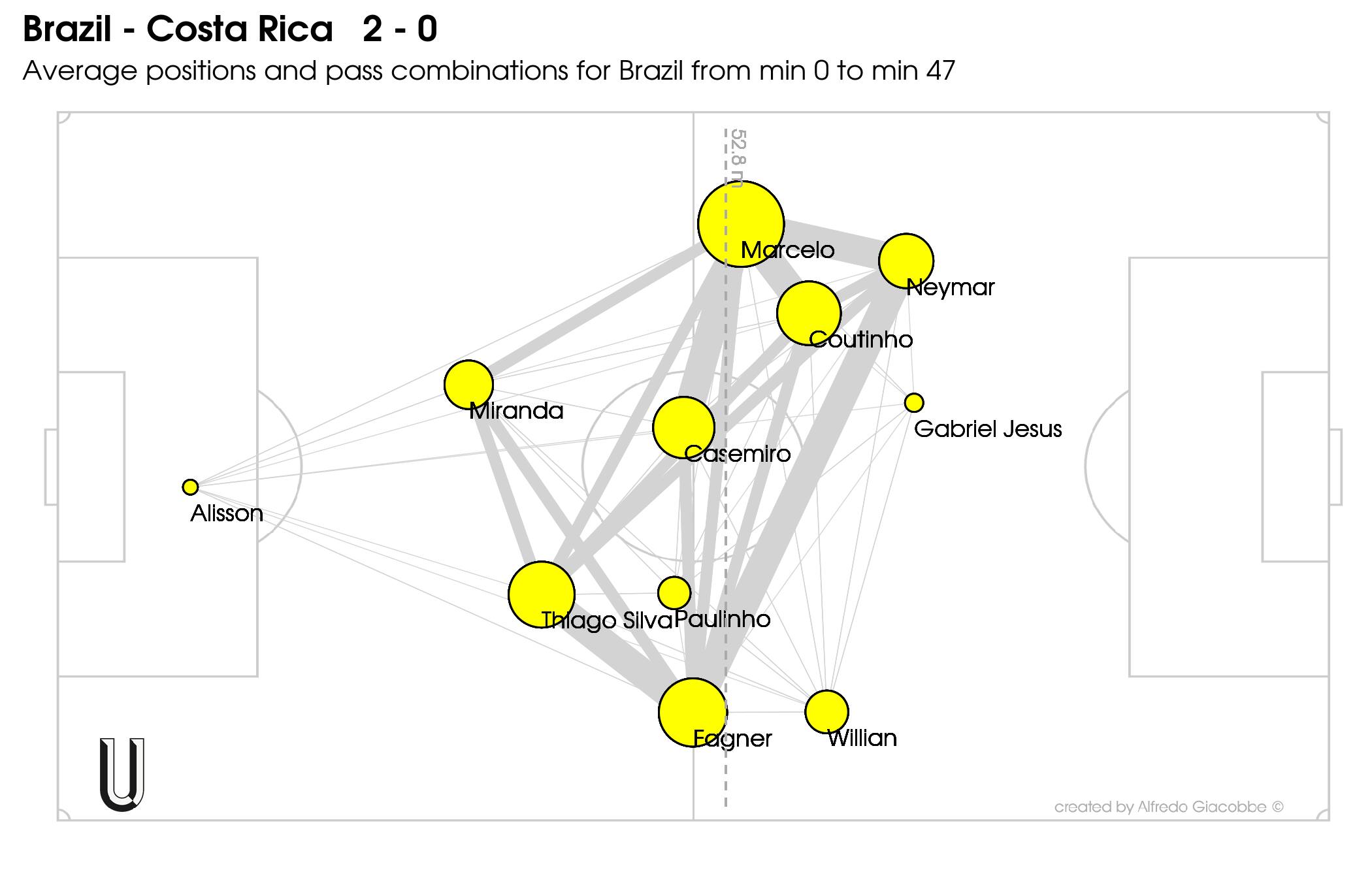 Il 4-3-3 del Brasile è chiaramente sbilanciato a sinistra: Marcelo, Coutinho e Neymar dominano il possesso mentre a destra le connessioni tra Fagner, Paulinho e Willian sono molto più deboli.