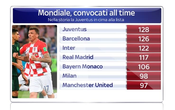 Comanda la Juve, nella storia nessun club ha fornito più calciatori dei bianconeri ai Mondiali. Non conta la nazionalità, anche se è facile dedurre che la maggior parte degli juventini convocati lo fossero per l'Italia. 128 in totale, due in più del Barcellona (126). Chiude il podio un'altra italiana: l'Inter, con 122 giocatori convocati. In generale è importante notare come ben 250 giocatori dei 7926 della storia dei Mondiali siano stati chiamati mentre militavano nella Juventus o nell'Inter, con il Milan al sesto posto complessivo (98) e a sole due "convocazioni" dal traguardo dei "cento".