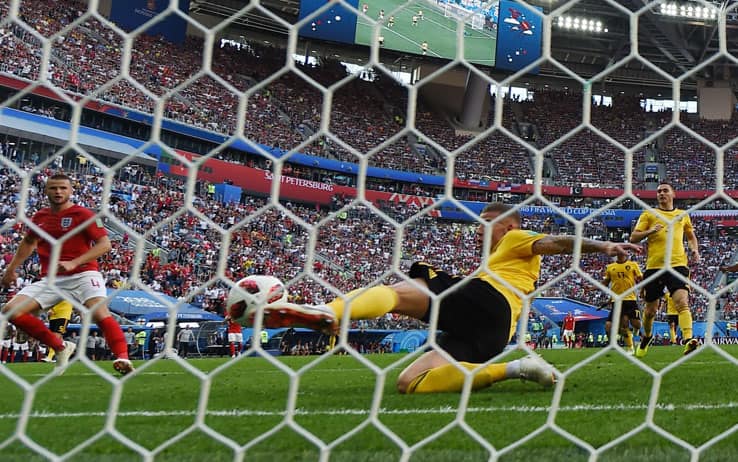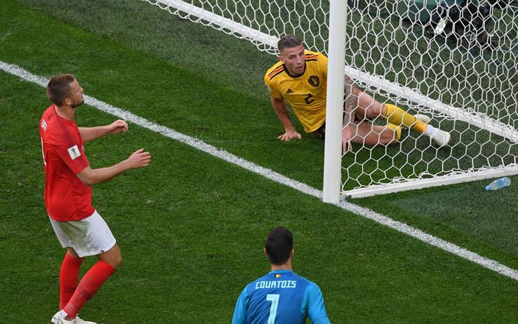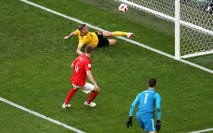 MondialiMinuto 70 di Belgio-Inghilterra: Dier sta per segnare un gran gol ma a salvare sulla linea respingendo il suo scavetto è il compagno di club, nel Tottenham, Alderweireld. Che poi si "scusa" con una pacca amichevole