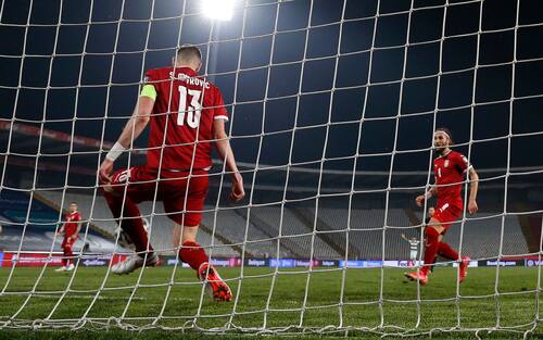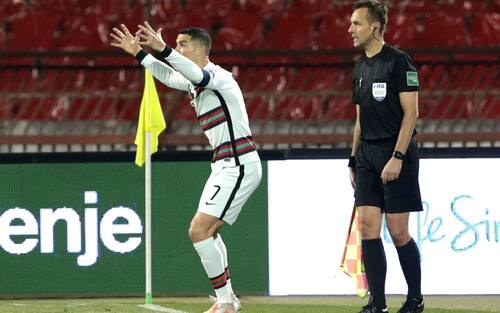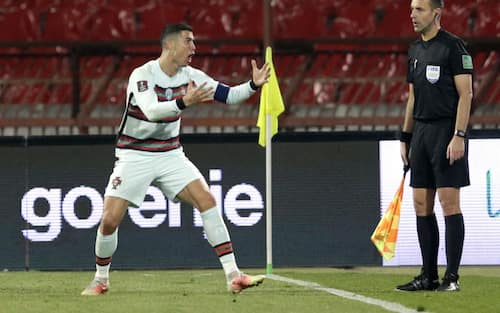L'episodio a dieci secondi dalla fine della partita valida per le qualificazioni Mondiali. Il risultato è sul 2-2 e CR7 trova la zampata decisiva nel finale che varrebbe i tre punti. Mitrovic spazza in scivolata, ma non prima che il pallone abbia superato interamente la linea di porta. Per arbitro e assistente (senza goal-line technology) non è gol, e il portoghese va su tutte le furie, lanciando a terra al fischio finale la fascia da capitano