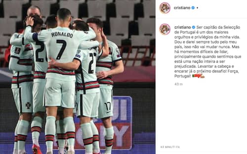 IL MESSAGGIO SU INSTAGRAM - Dopo il "giallo di Belgrado" CR7 ha commentato sui social il match e l'episodio: "Essere il capitano della nazionale portoghese è uno dei più grandi orgogli e privilegi della mia vita - ha scritto -. Ho dato e darò sempre tutto per il mio Paese, questo non cambierà mai. Ma ci sono momenti difficili da affrontare, soprattutto quando sentiamo che un'intera nazione viene danneggiata. Alziamo la testa e affrontiamo subito la prossima sfida! Andiamo, Portogallo!"
