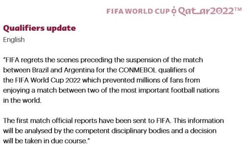 IL COMUNICATO DELLA FIFA - La Fifa si rammarica delle scene che hanno preceduto la sospensione della partita tra Brasile e Argentina per le qualificazioni Conmebol alla Coppa del Mondo 2022, che hanno impedito a milioni di tifosi di godersi una partita tra due delle nazioni calcistiche più importanti del mondo - è scritto nella nota -. I primi resoconti ufficiali della partita sono stati inviati alla Fifa. Queste informazioni saranno analizzate dagli organi disciplinari competenti e una decisione sarà presa a tempo debito"