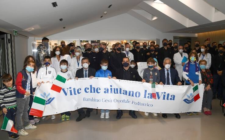 “Sul campo e nella vita insieme vinciamo la partita”. E' uno dei tanti pensieri che i bambini ricoverati all'Ospedale Bambino Gesù di Roma hanno destinato attraverso i loro disegni agli Azzurri che venerdì si giocheranno l'accesso diretto al Mondiale 2022 contro la Svizzera all'Olimpico. L'Italia era già stata in visita all'ospedale pediatrico nel 2016 con Antonio Conte Ct alla vigilia della partenza per l'Europeo e nel 2019 prima della pandemia. Questa volta però gli Azzurri si sono ripresentati ai loro giovani tifosi ricoverati con la Coppa di Euro 2020. La delegazione della Nazionale, capitanata dal presidente della Figc, Gabriele Gravina, e dal Ct, Roberto Mancini, è arrivata al nosocomio alle 18:20, accolta dalla presidente del Bambino Gesù, Mariella Enoc, e si è trattenuta per circa un'ora e mezzo. I giocatori sono entrati nei diversi vari reparti, dal pronto soccorso alle terapie intensive, dalla neonatologia alla pediatria, dalla cardiologia all'oncologia, non prima di aver incontrato un gruppo di bambini ospiti delle case di accoglienza per la consegna dei doni: le felpe con il logo del Bambino Gesù e della Federcalcio, un gagliardetto realizzato dai bambini e dai ragazzi della ludoteca. Una giovane tifosa ha regalato a Mancini un disegno con la Coppa dalla quale fuoriescono tre bambini con un pallone e in basso figurano un medico e un calciatore azzurro, mentre 'Insieme si vince' è lo slogan del gagliardetto che un piccolo ha regalato a Leonardo Bonucci.