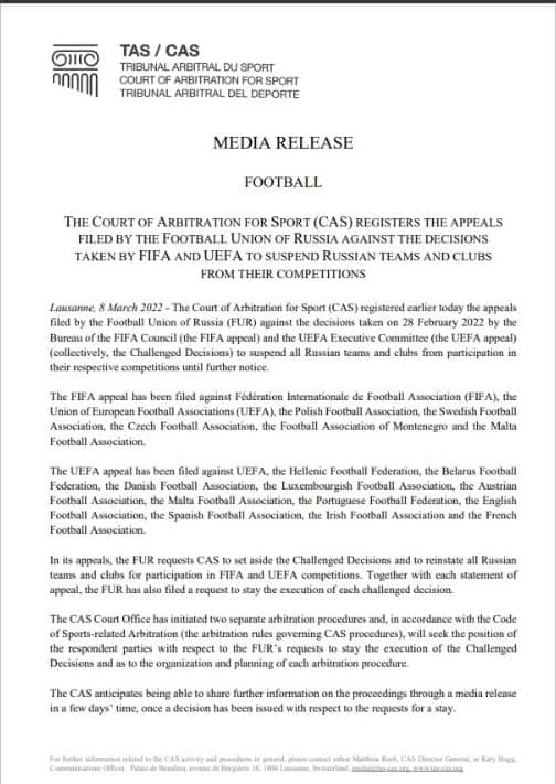 La Russia non ci sta. Dopo la decisione di Fifa e Uefa di sospendere le formazioni russe dalle competizioni internazionali, la Federcalcio russa (RFU) ha avviato un'azione legale davanti al TAS di Losanna. La Rfu, che ha presentato istanza di sospensione dell'esecuzione di tali sanzioni, chiede che vengano annullate le decisioni assunte, reintegrando nazionali e club alle competizioni. Il tema principale riguarda la nazionale russa che a fine marzo avrebbe dovuto disputare gli spareggi di qualificazione ai Mondiali. In questo senso, la Federcalcio russa ha presentato ricorso anche nei confronti delle federazioni calcistiche di quei Paesi che hanno chiesto l'esclusione della Russia dai Mondiali (Polonia, Svezia, Repubblica Ceca, Montenegro e Malta). Il Tribunale Arbitrale dello Sport ha avviato due procedure arbitrali separate e nei prossimi giorni si esprimerà in merito.