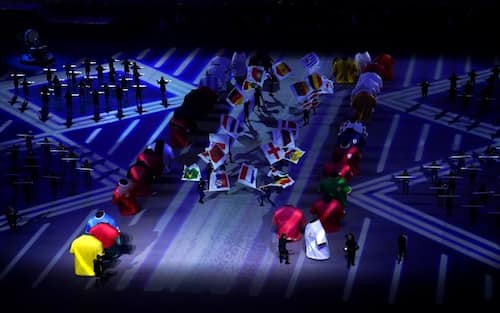 - Poi hanno fatto il loro ingresso le maglie delle 32 nazionali con gli sbandieratori italiani di Faenza tra i protagonisti della cerimonia. Italia presente anche nelle coreografie, ideate dal nostro Marco Balich.