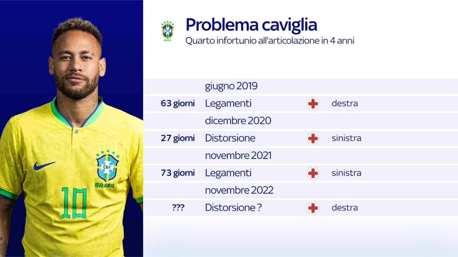 Non si tratta del primo infortunio alla caviglia, per Neymar, che anzi negli ultimi anni ha dovuto spesso fare i conti con questo tipo di problema. Solo negli ultimi cinque anni, questo subìto contro la Serbia è il quarto infortunio alla caviglia. Nella stagione 2018/2019, questo tipo di problema lo tenne fuori 63 giorni. Nel 2020/2021, un infortunio simile lo mise out per 27 giorni. Quindi, nel 2021/2022, sempre per la caviglia, restò fuori 71 giorni. E a tenere in ansia il Brasile c’è il precedente del mondiale in casa del 2014. In quell’occasione, Neymar si infortunò nei quarti con la Colombia, per un intervento dell’ex napoletano Zuniga. Saltò così la semifinale contro la Germania, poi persa 1-7 dalla Seleçao. Che oggi ovviamente conta di scrivere una storia diversa.