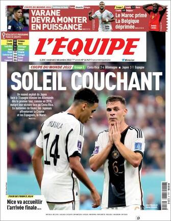- "Soleil cuchant" ovvero "Il sole al tramonto" è il titolo con cui apre l'edizione odierna de L'Equipe, per parlare della clamorosa uscita di scena della Germania